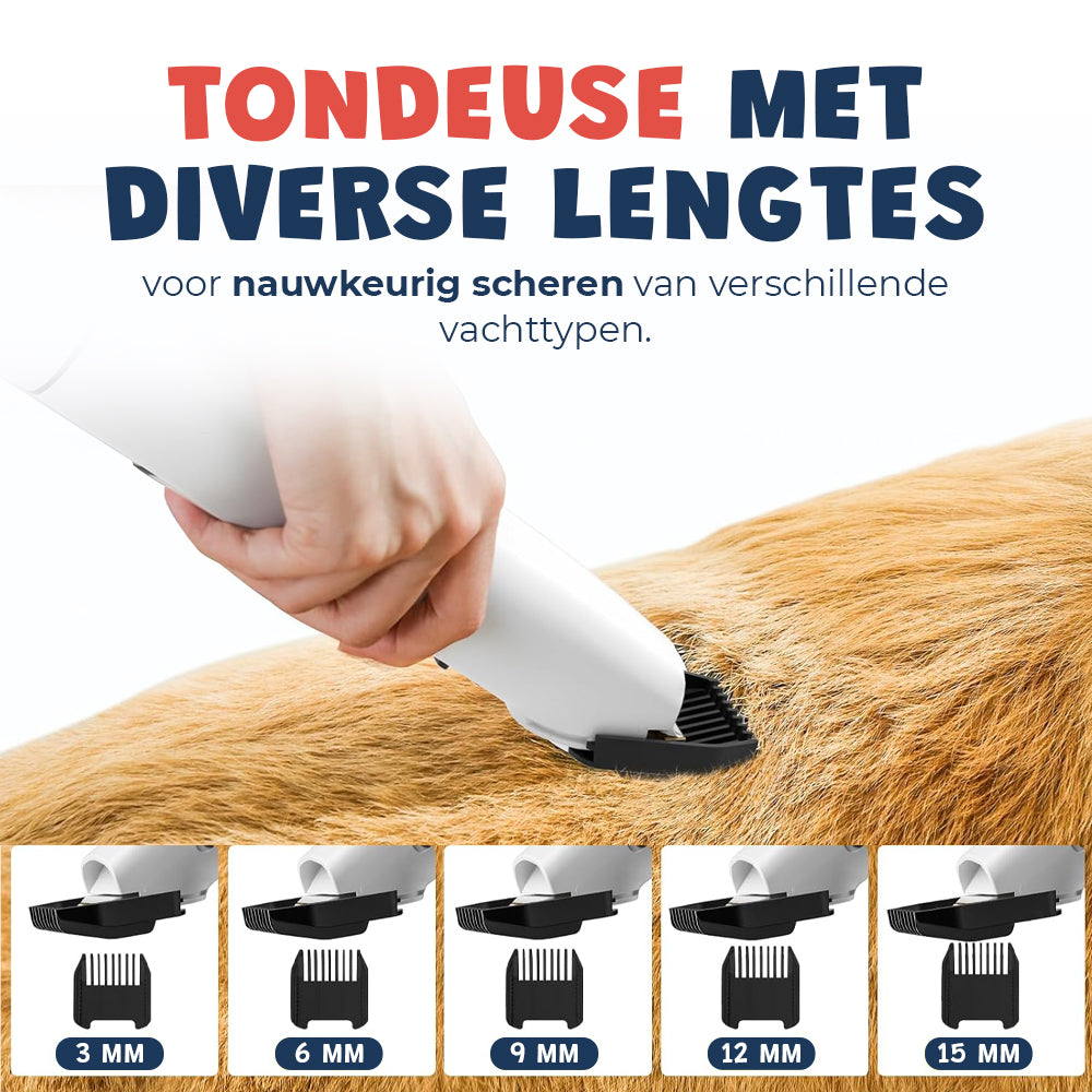 - Tondeuse met 5 lengtekammen (3/6/9/12/15 mm): Geschikt voor nauwkeurig scheren van diverse vachttypen.