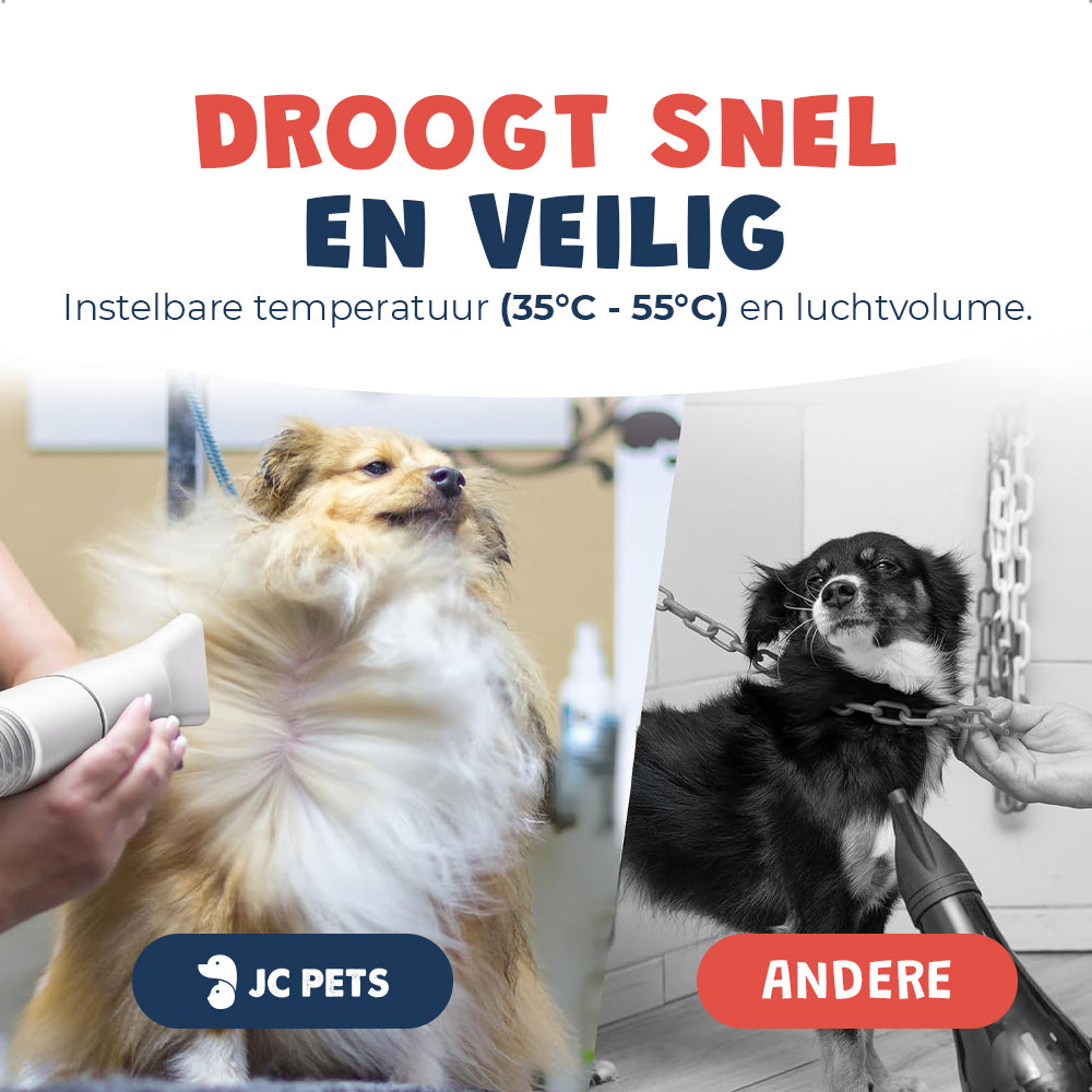 Absoluut. De temperatuur is instelbaar tussen 35°C en 55°C, zodat je altijd de juiste warmte kunt kiezen voor een comfortabele droogervaring. De luchtstroom is bovendien ontworpen om zacht en gelijkmatig te zijn, wat stress bij je huisdier minimaliseert.