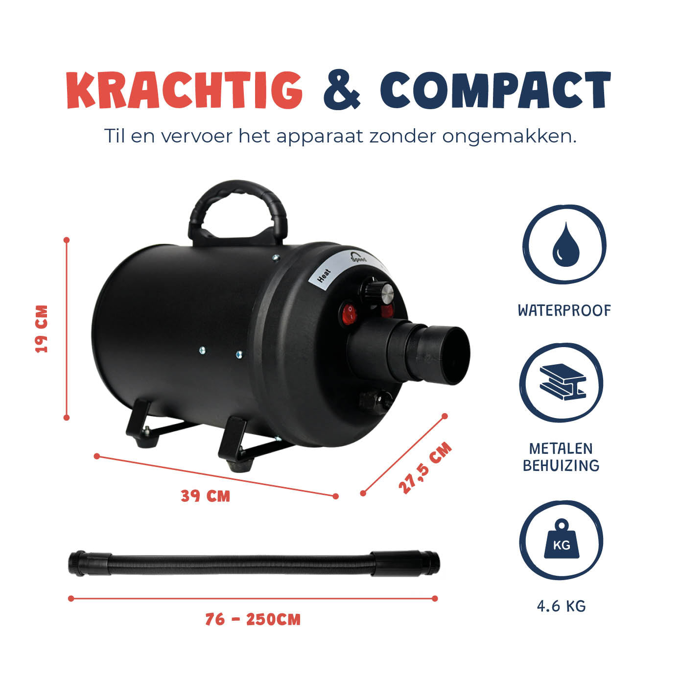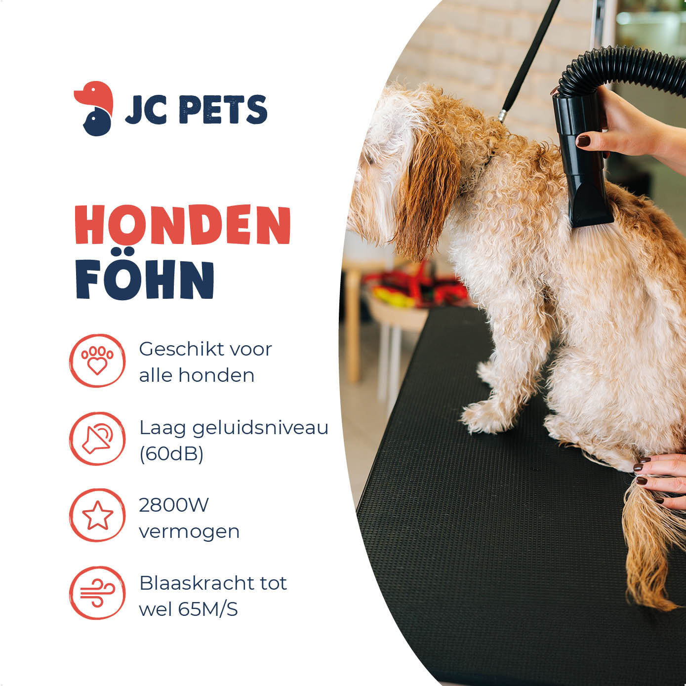 - Inhoud Verpakking: JC Pets Hondenföhn, 4 mondstukken, föhnslang, Nederlandse handleiding.