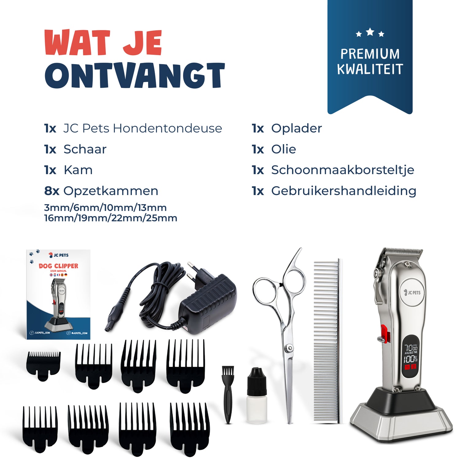 Wat je ontvangt | JC Pets Hondentondeuse + oplaadstation, 8 opzetkammen, schaar, kam, oplader, olie, schoonmaakborsteltje en handleiding. |