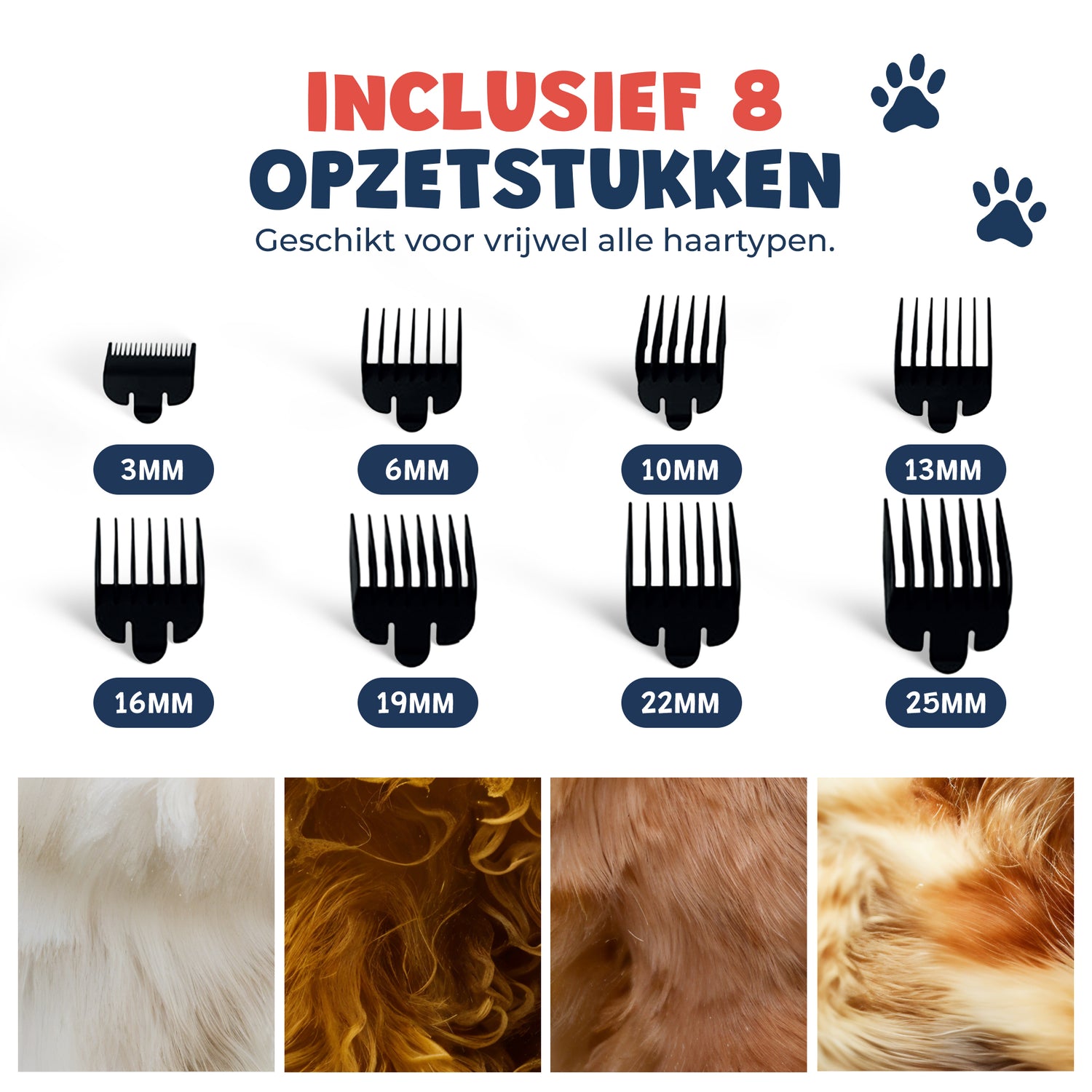 ✓ Wordt geleverd met 8 verschillende opzetkammen (3mm, 6mm, 10mm, 13mm. 16mm, 19mm, 22mm en 25mm) om aan verschillende haarlengtes en trimbehoeften te voldoen.