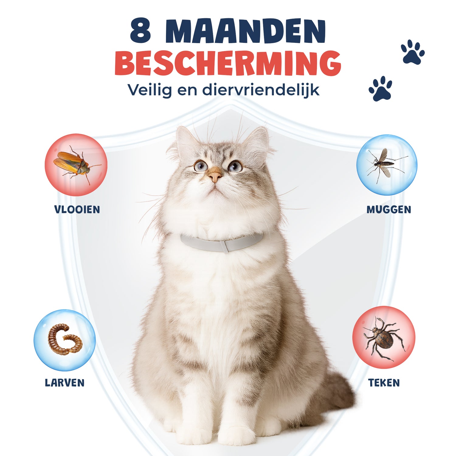 Dit teken en vlooienmiddel biedt gedurende 8 maanden volledig bescherming tegen vlooien, teken en ander ongedierte. De halsband zal het ongedierte doden en verjagen. Nadat je de halsband bij je kat om hebt gedaan zal het direct bescherming bieden tegen vlooien. De halsband werkt door middel van verschillende essentiële oliën die zich continu verspreiden over de vacht van je huisdier.